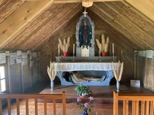 Nous avons terminé par une visite chez les sœurs Bernardines, le cimetière de sable, la chapelle de paille, la cellule d’Elise Cestac, (sœur du Père Louis Edouard Cestac), la chapelle avec en guise d’autel une magnifique meule de pierre.